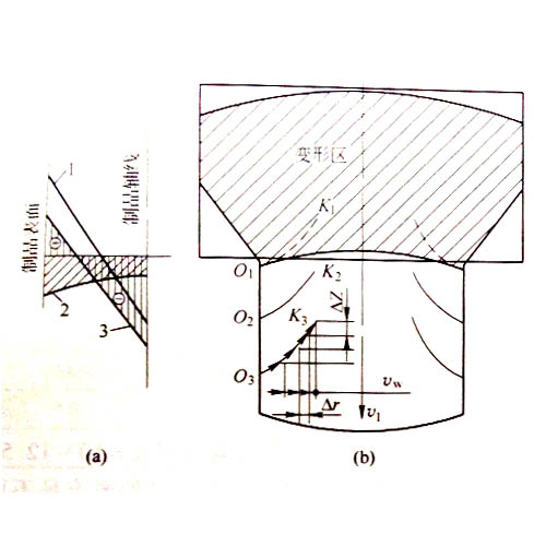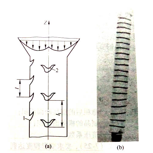 工業(yè)鋁型材擠壓速度增快,溫度升高,鋁型材抗拉強(qiáng)度降低;表面金屬疊加后產(chǎn)生的工作拉力和應(yīng)力時(shí),就會(huì)出現(xiàn)裂紋,裂紋的狀態(tài)取決于裂紋向深部擴(kuò)展的速度和鋁型材的流出速度的相互關(guān)系;第一條裂紋出現(xiàn)以后,疊加后形成的工作拉應(yīng)力得到釋放,應(yīng)力減小,從而使裂紋向深部擴(kuò)展的速度減慢。若υw為等減速擴(kuò)展,則每一瞬間裂紋加深值為Δr,而鋁型材以固定速度υ1移動(dòng)ΔZ值,其結(jié)果得到裂紋如圖1所示。當(dāng)此裂紋擴(kuò)展到一定深度后,該局部的附加應(yīng)力消失,裂紋停止發(fā)展;隨后金屬又呈周期性的出現(xiàn)裂紋,如圖2所示,直到調(diào)整擠壓速度為止。